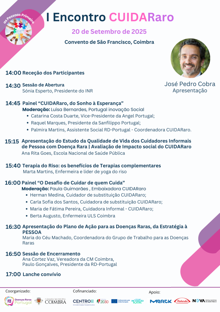 No dia 20 de setembro 2025, o Convento São Francisco, em Coimbra, recebeu o I Encontro CUIDARaro, uma conferência nacional dedicada a reconhecer, valorizar e apoiar os cuidadores informais de pessoas com doenças raras. A iniciativa foi promovida pela RD-Portugal, em parceria com a Câmara Municipal de Coimbra, e com o apoio de vários parceiros institucionais, reunindo especialistas, decisores políticos, profissionais de saúde, cuidadores e associações de doentes.